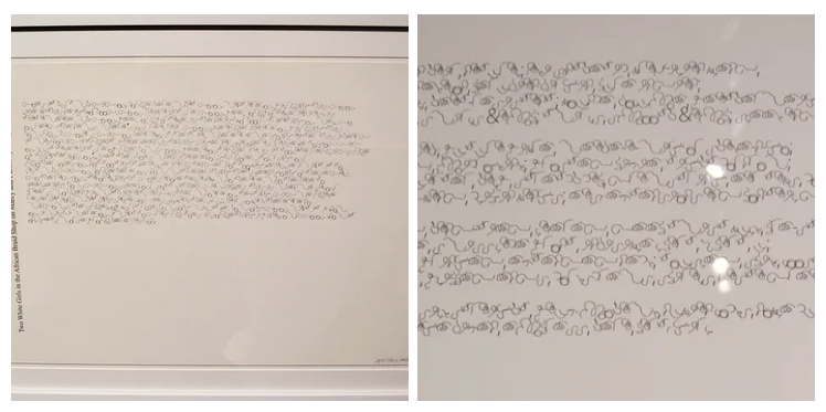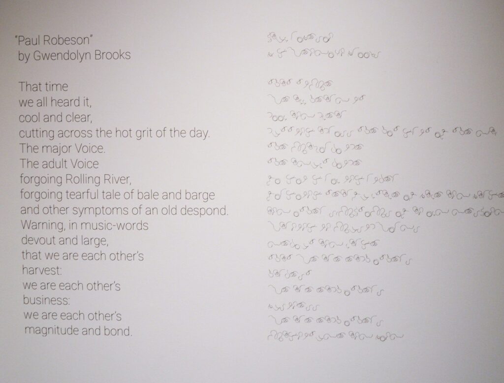 The exhibit takes its title from a line in a poem by Gwendolyn Brooks called “Paul Robeson.” It is printed on the wall in the Latin alphabet and in the Twist alphabet. Just as Brooks paid tribute to an older African-American artist in writing “Paul Robeson”, Clark continues that practice of honoring older artists in 1-877-OUR-CURL. This chain of respect feels especially necessary as Trump and his allies seek to erase the visibility black artists’ work. We see this erasure already in the cleaning out of libraries.