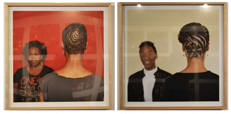 Twist with its basis in hair points to another focus of Clark’s artistic practice—black hair culture. In The Hair Craft Project: Hairstylists With Sonya, Clark presents a series of photographs with two female figures each represented roughly from chest high. The figure on the left is facing the viewers while the one on the right is facing away in a pose that shows off the back of her head. The figure on the left is standing slightly further from the viewer than the one on the right, and due to the depth of field setting, the figure on the left is slightly out of focus while the figure on the right is sharp. In each photo, the figure on the right is a hairstylist and the figure on the left shows off an example of the hairstylist’s work.
