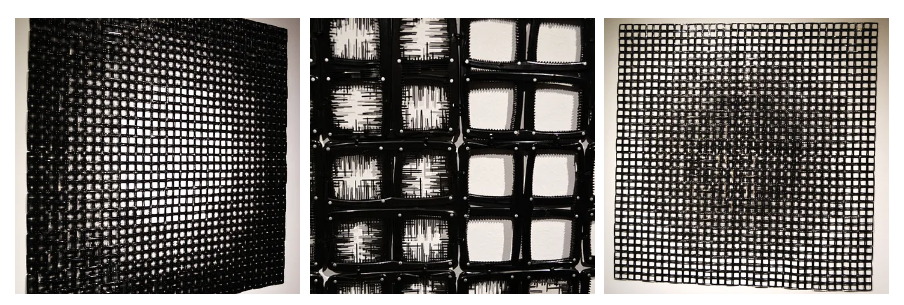 The tools of a hair stylist are memorialized (and monumentalized) in two large found object wall sculptures, Hole Whole and Whole Hole. Both are constructed of hundreds of well-worn (if not completely busted) combs. Clark uses the teeth of the comb to create a kind of chiaroscuro which from a distance become a rough lens shape.