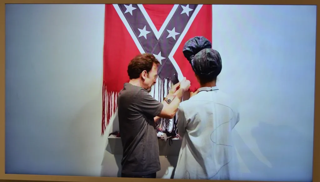 The actual truce fag is an ordinary object, quite tiny. It can only be monumentalized by assigning it a profound historical meaning. Clark wouldn’t mind “unmonumentalizing” its better-known counterpart, the Confederate Battle Flag.