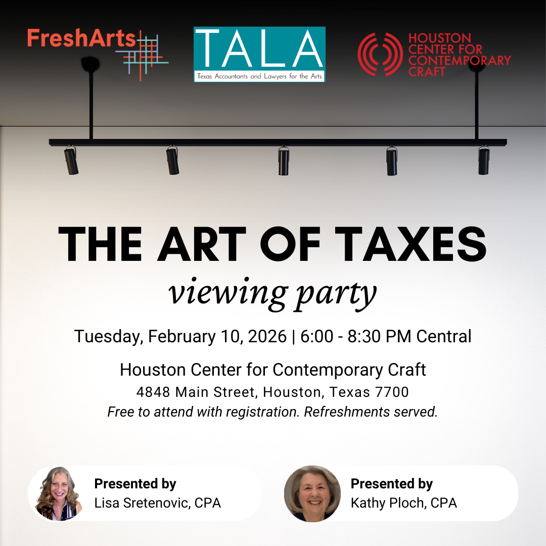 Join HCCC, Fresh Arts, and TALA (Texas Accountants and Lawyers for the Arts) for a viewing party for TALA’s Art of Taxes 2026 livestream event! Connect and network with fellow artists while CPAs Lisa Sretenovic and Kathy Ploch guide you through your tax return, addressing common concerns for artists and important IRS regulations related to creative practices, including: