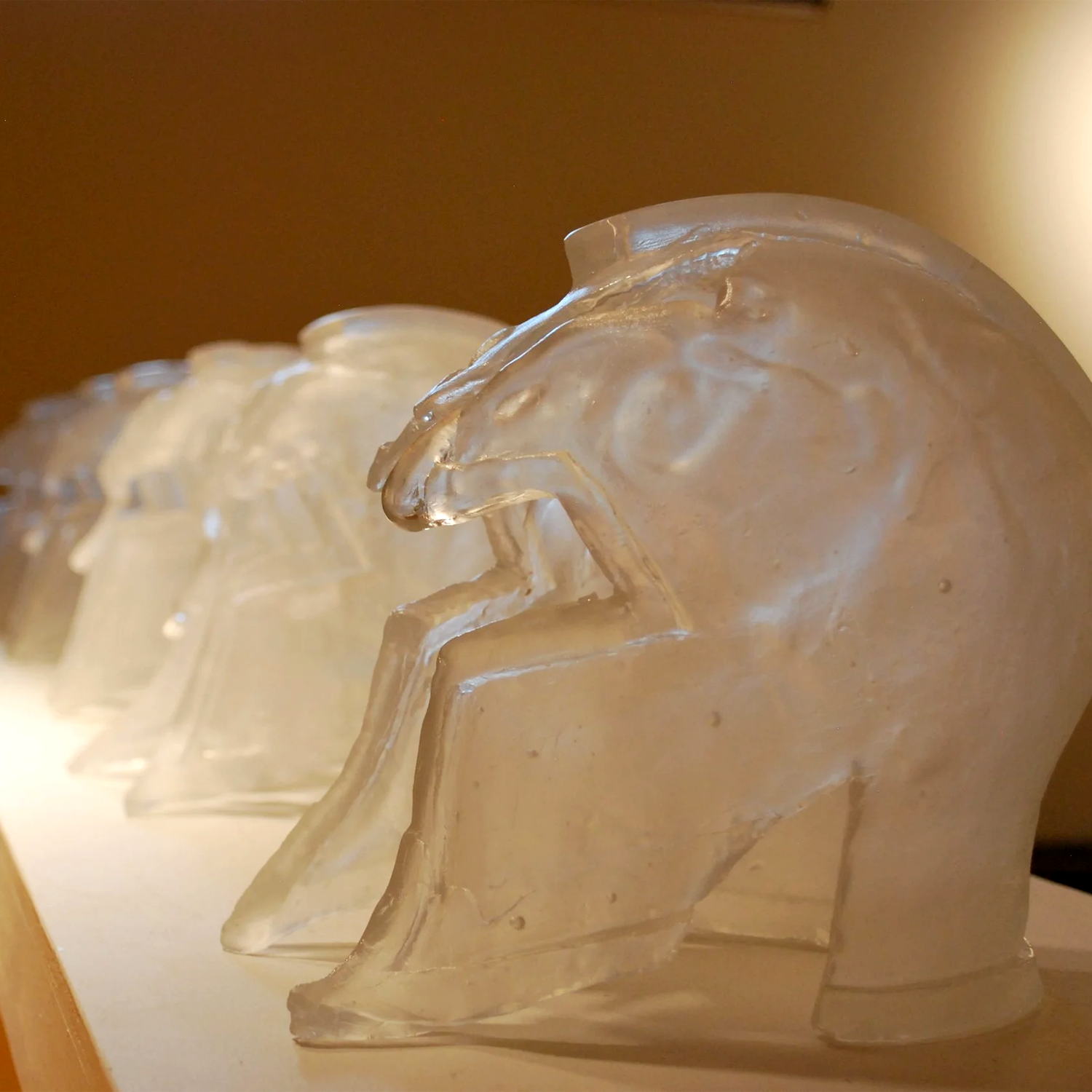 Qin creates the work using the lost-wax casting process. She first sculpts the form in clay, then makes silicone molds, and produces wax replicas that are encased in heat-resistant molds. During firing, the wax melts away and molten glass slowly fills the hollow cavity, capturing every crack, dent, and surface detail of the original. Through this meticulous process, Qin merges Chinese historical traditions with Western philosophical inquiry to examine the weight of pride, protection, and perception.
