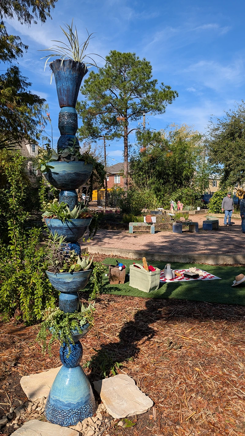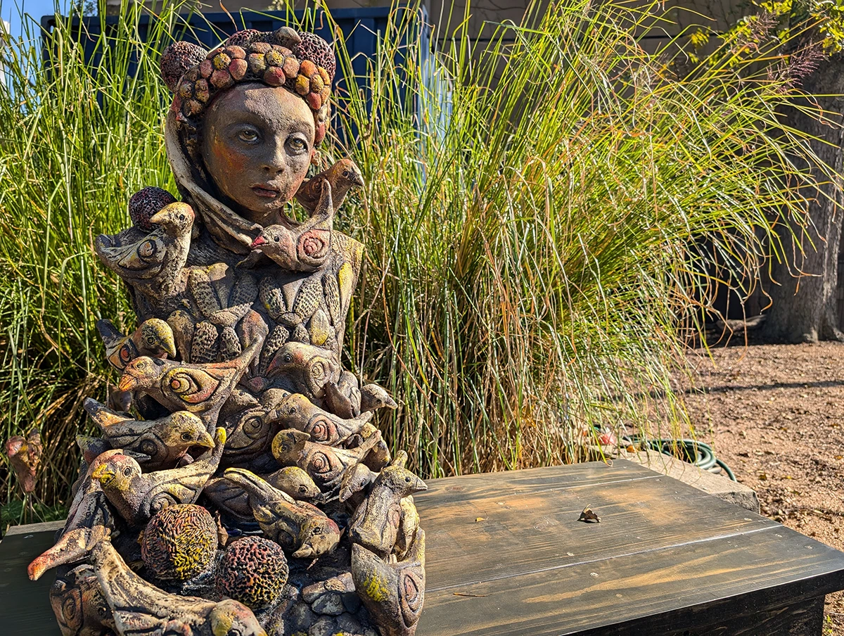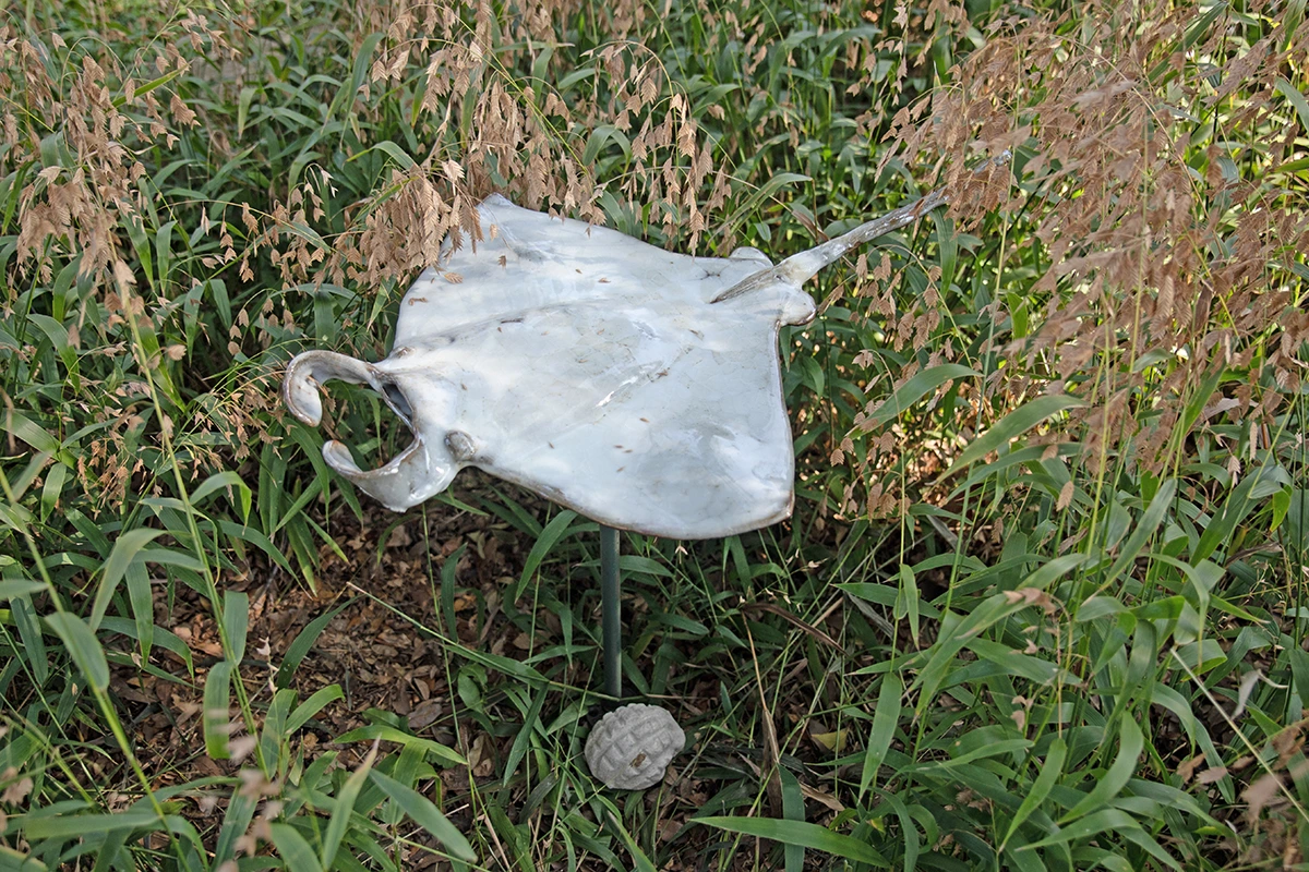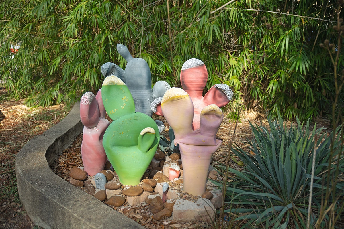 Installed in the Craft Garden at Houston Center for Contemporary Craft, CITE (Ceramics in the Environment) features site-specific ceramic sculpture created by students from the Museum of Fine Arts, Houston’s Glassell School of Art. Led by former HCCC resident artist Jeff Forster, the artists in his Special Topics class were tasked with exploring the narrative potential of the location and creating artwork inspired by the garden’s flora and fauna.